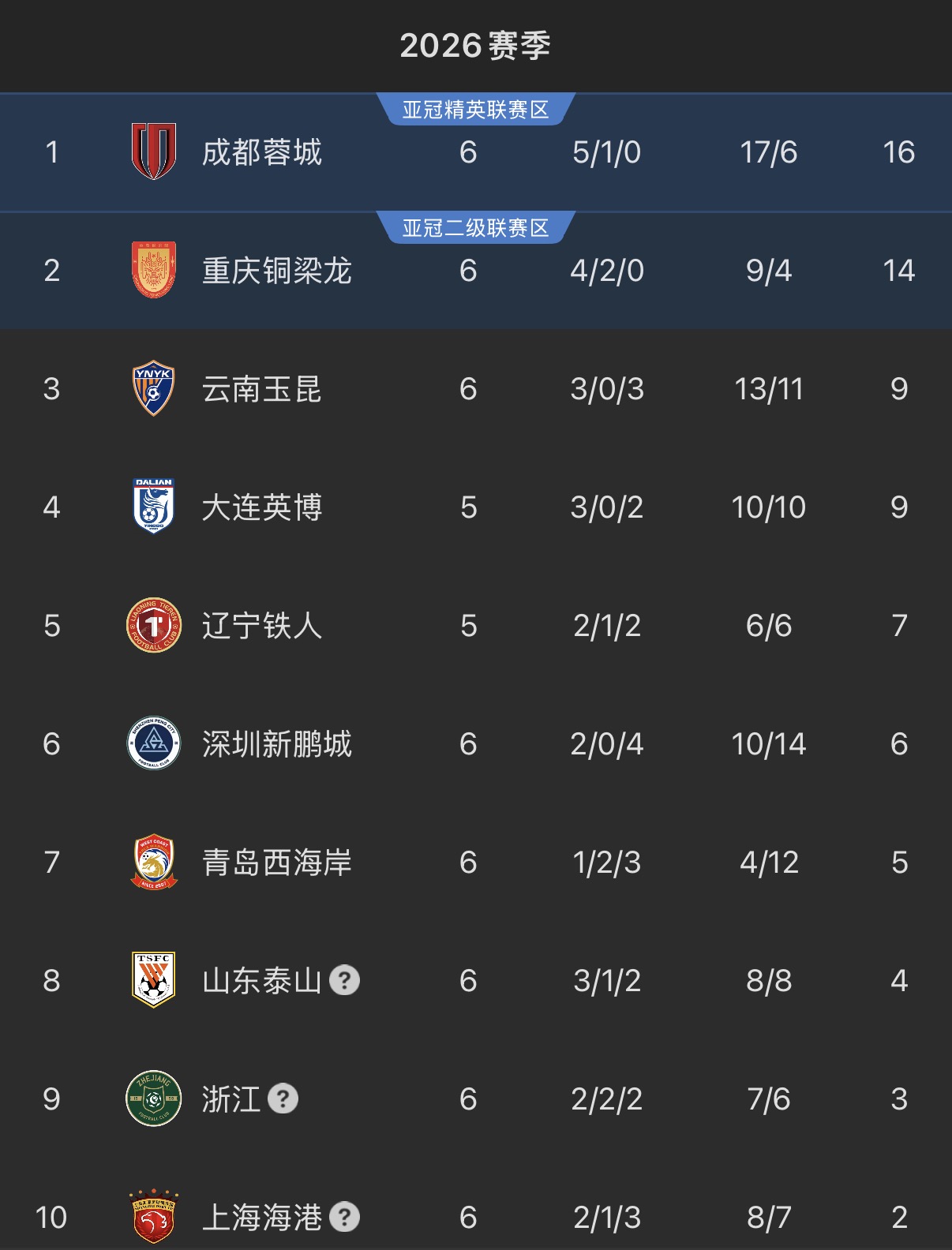 目前六轮过后,成都蓉城5胜1平积16分继续领跑中超积分榜。值得一提的是,重庆铜梁龙本轮在主场2-0战胜深圳新鹏城,以4胜2平积14分的战绩排名第二,紧追榜首的成都蓉城。成渝两兄弟联袂以不败战绩占据积分榜前二,这也值得川渝球迷携手庆贺。